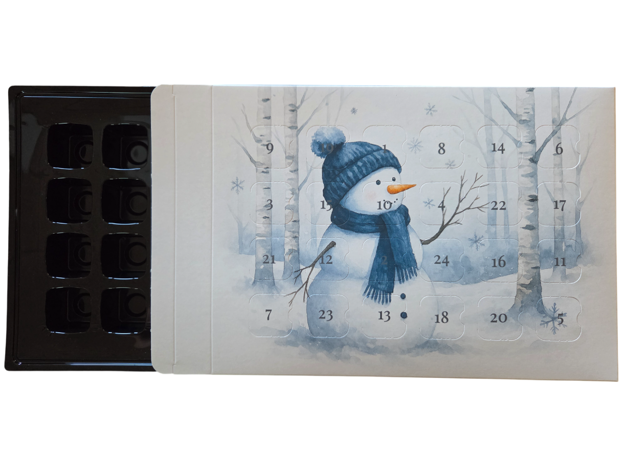 De 24 lukene skjuler avgrensede rom som kan fylles med sjokolade/pralines, karameller, små gaver eller hjemmelagde godsaker. Du kan også bruke kalenderen til kreative overraskelser som smykker eller små såpestykker.