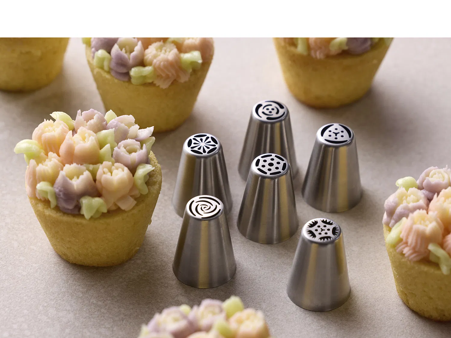 Tyllsett med 6 tyller for enkel blomsterlaging i smørkrem og lignende. Også kalt Russian nozzles.