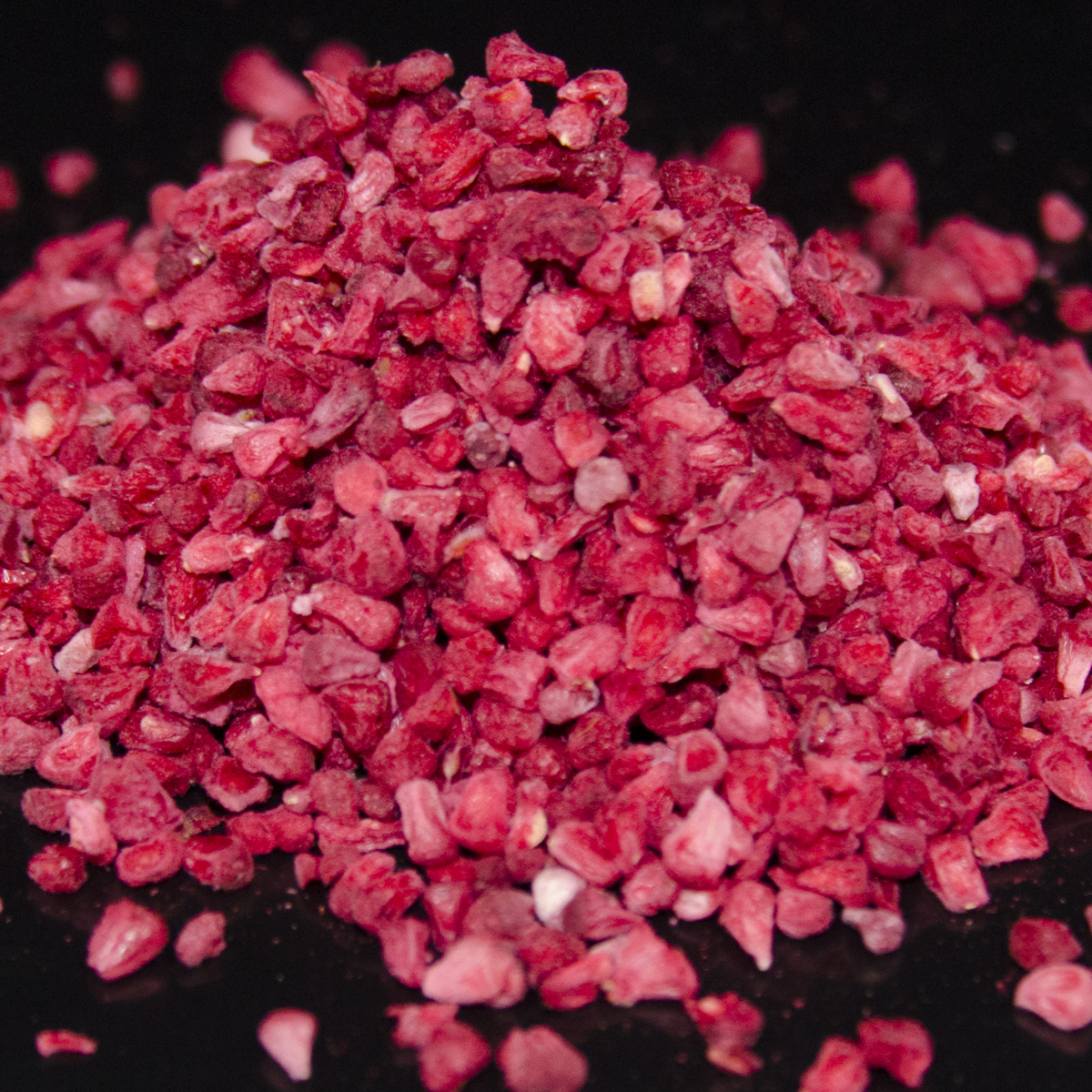 Vakre og intense bringebærbiter av frysetørkede bringebær.