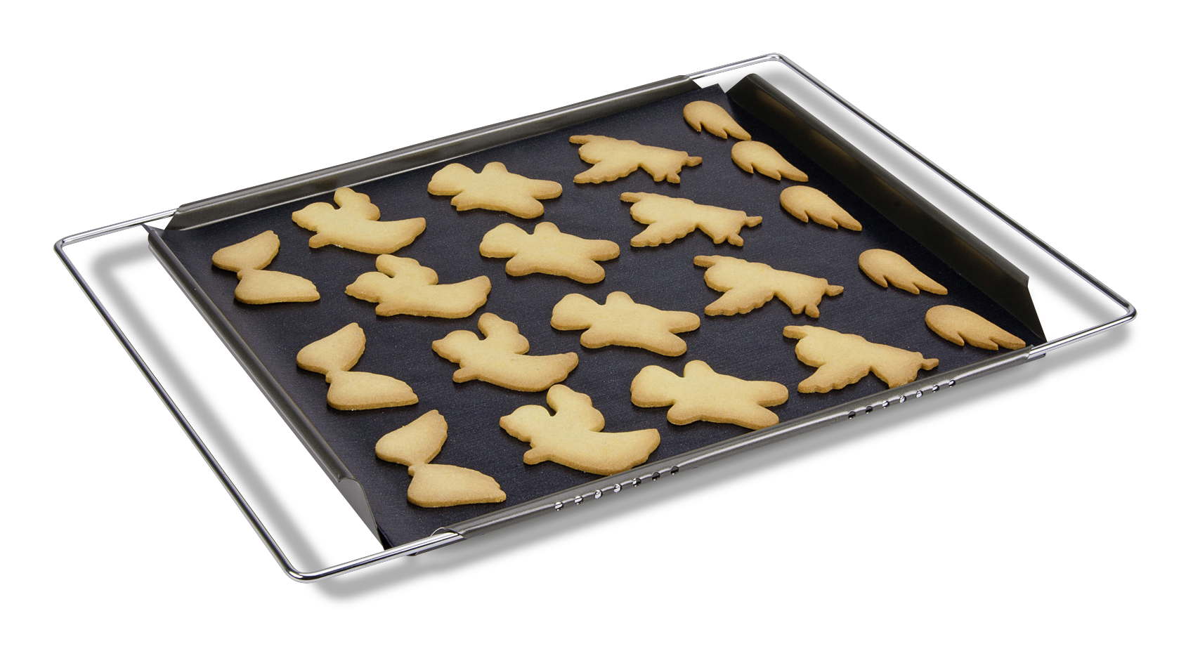Bredden på stekebrettrammen kan justeres fra ca. 40-55 cm, noe som gjør at den passer til nesten alle standard ovner.