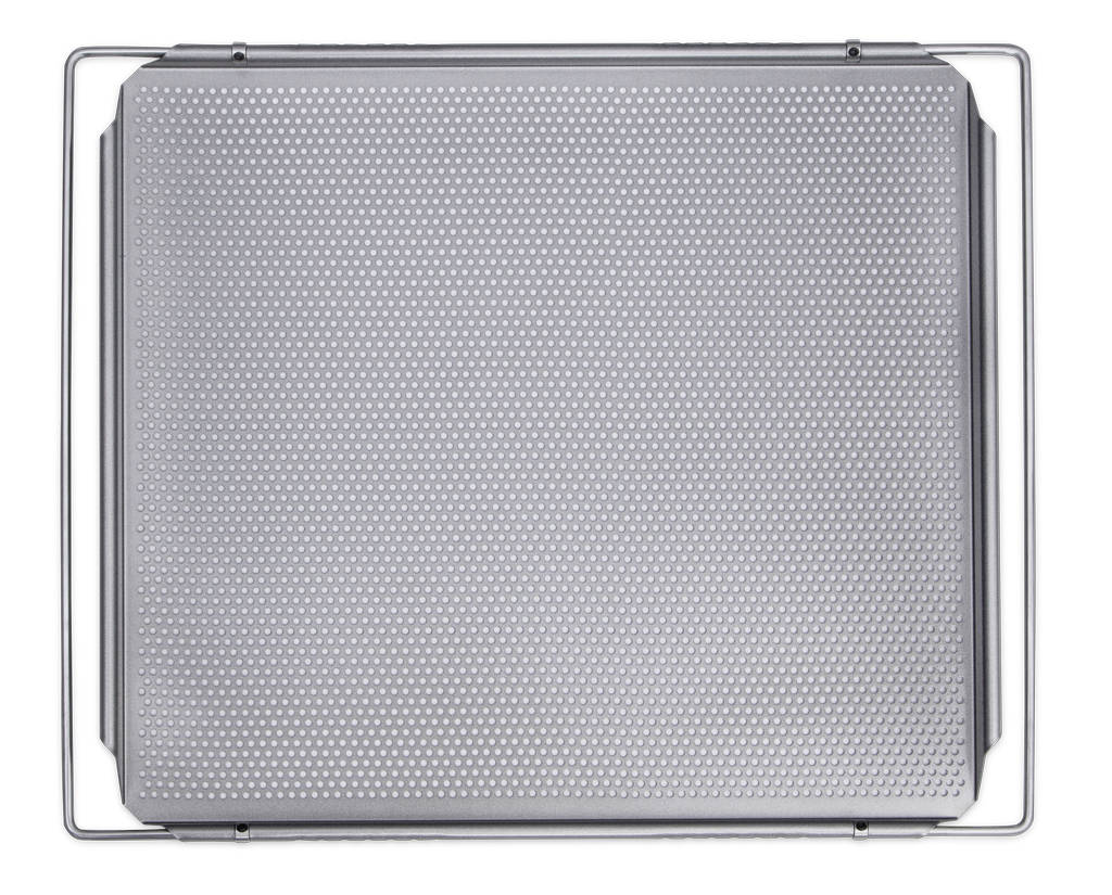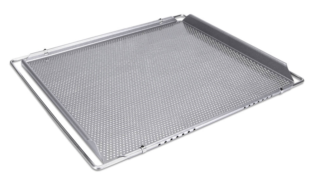 Denne platen har en fin perforering som gjør at damp og varme kan sirkulere rundt bakevarene.