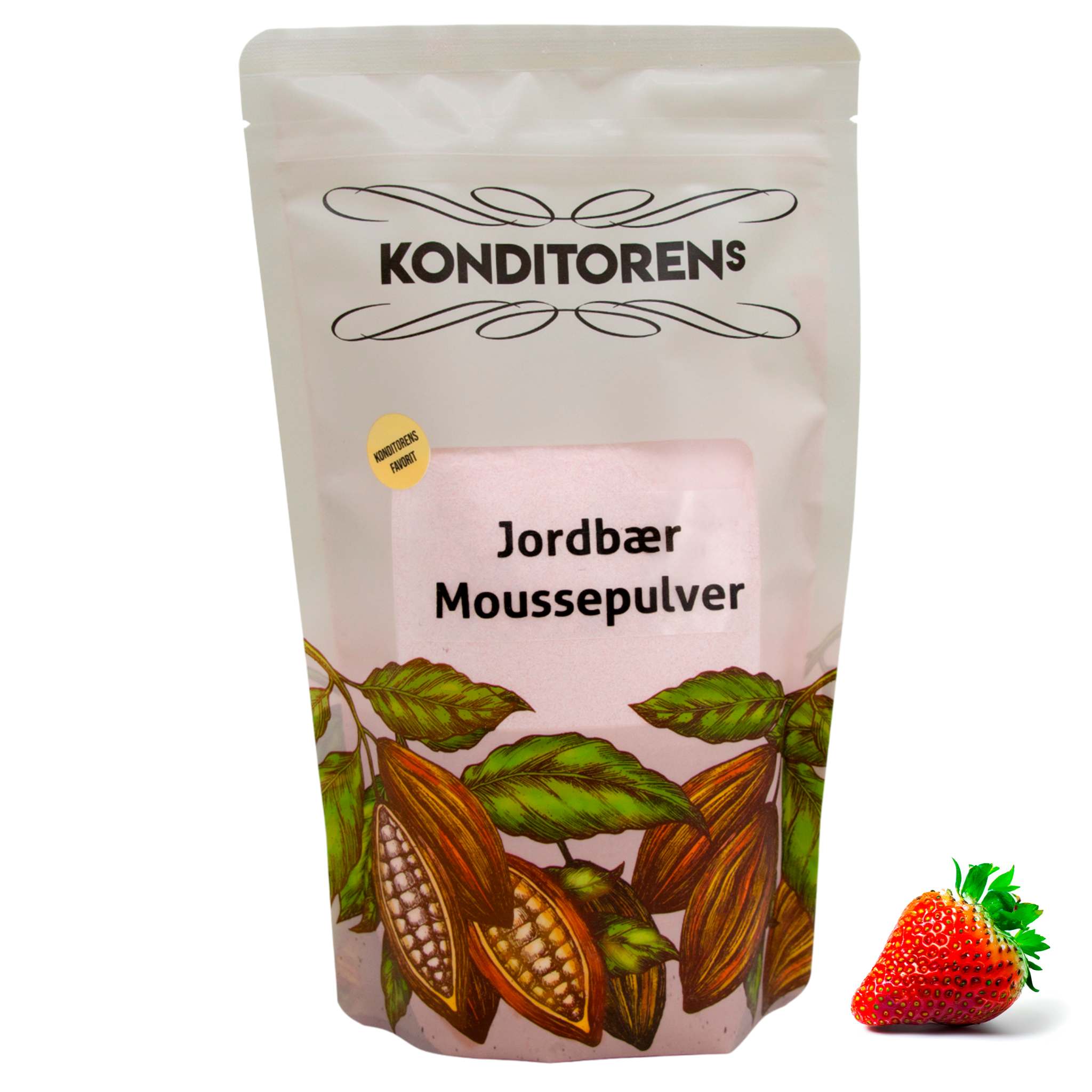 Fromagepulver med biter av frysetørkede jordbær, til kaker og desserter der man ønsker en fast fløtemousse. Kun naturlig smak og farge.