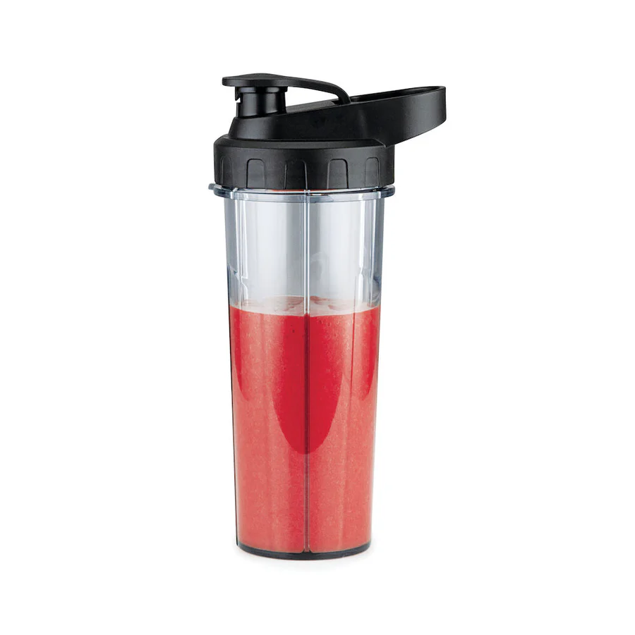 Flasken leveres med et blad som er optimalisert for blending av frosne ingredienser, og et lokk som gjør at blenderen raskt kan forvandles til en vannflaske.
