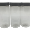 Plastbeholderne er laget av gjennomsiktig plast, med sort plastlokk.