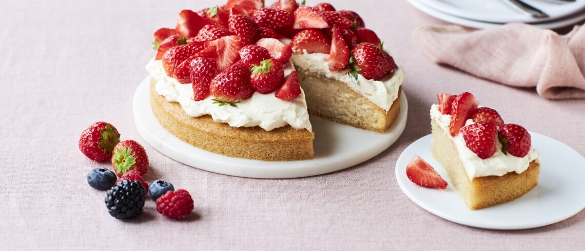 Valsemøllen Sommerkake er en enkel kakeblanding som på under 1 time gir deg hjemmelaget jordbærkake med saftig makarinkakebunn og fløyelsmyk konditorkrem. Det gjør det raskt og enkelt å servere sommerens mest populære kake.