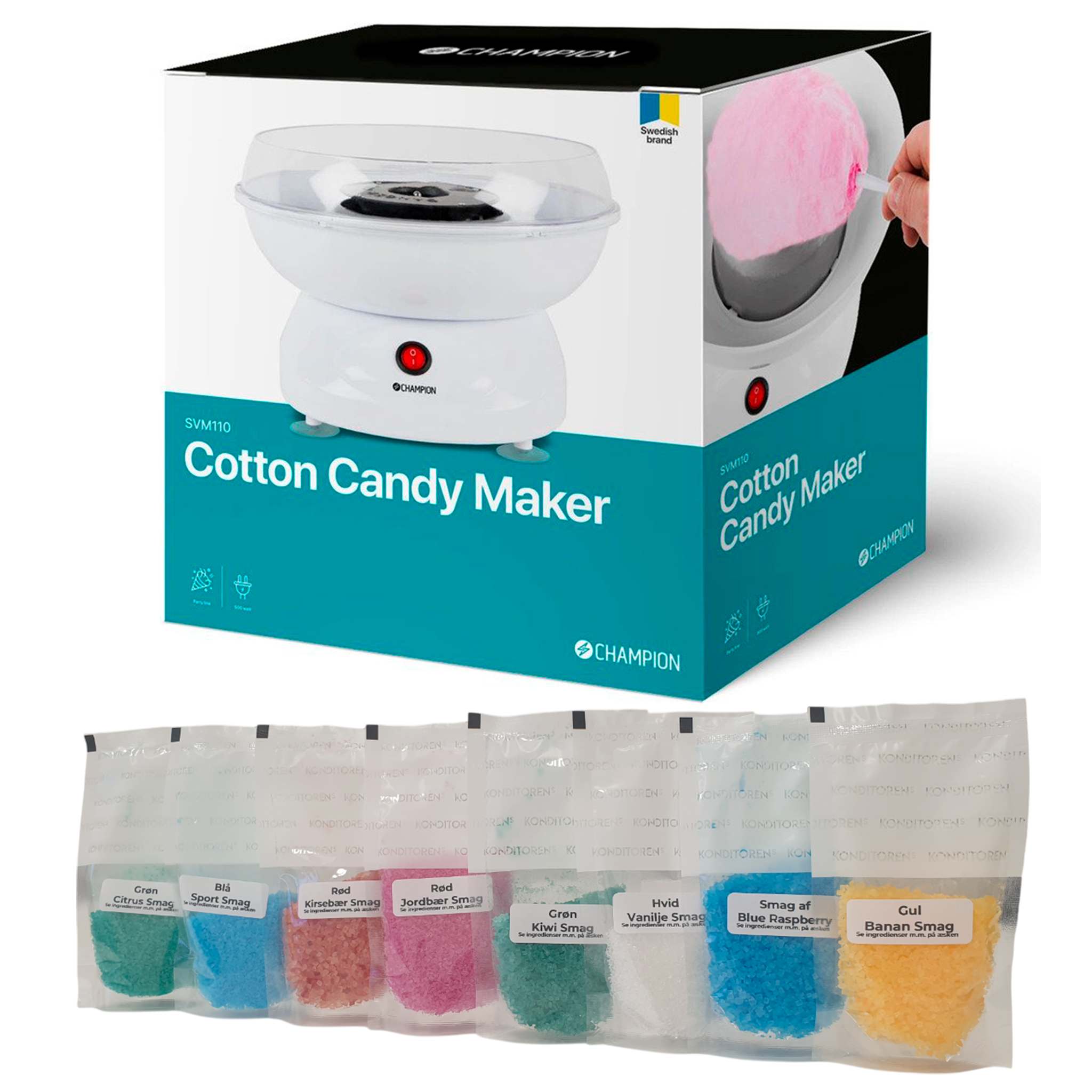 Champions candy floss-maskinen er for eksempel perfekt til barnebursdager.