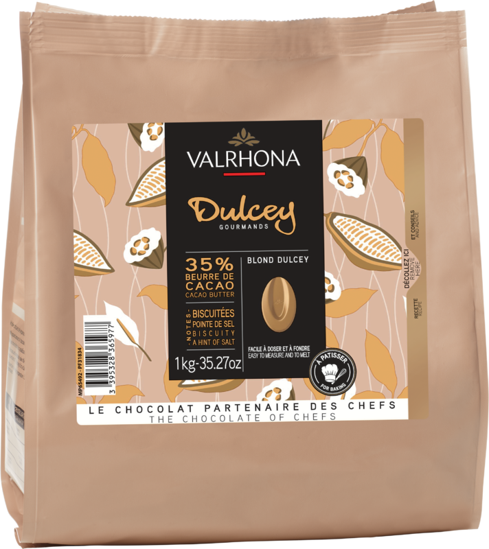 Dulcey 35% er en hvit sjokolade med en unik farge og fløyelsaktig konsistens. Smaken er intens med toner av kjeks. Sjokoladen nytes best sammen med karamell, kaffe, hasselnøtter og gule frukter - perfekt til desserter og fylte fristelser.