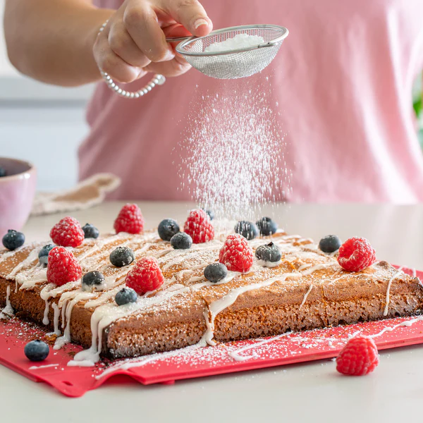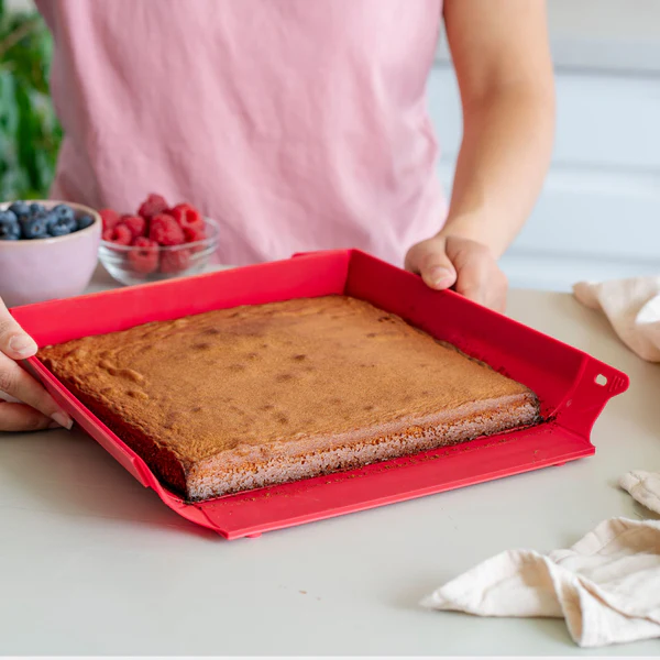 Formen har metallforsterkning både i bunnen og på sidene for maksimal stabilitet og enkel håndtering – selv med tunge eller flytende retter. Det silikonbaserte non-stick-belegget sørger for at ingenting kleber seg fast og eliminerer behovet for bakepapir eller fett.