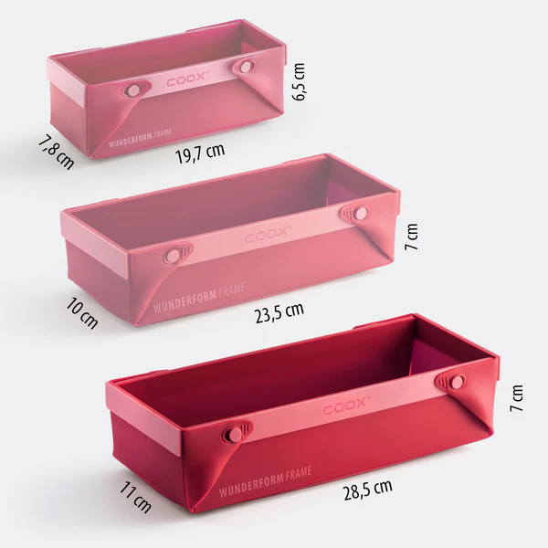 WUNDERFORM Frame L fra coox er den smarte og fleksible bakeformen som gjør baking og matlaging enklere og mer praktisk. Takket være den patenterte foldefunksjonen i hjørnene er det ikke nødvendig å snu kaker, brød og ovnsretter ut av formen – det er bare å åpne den og servere direkte.